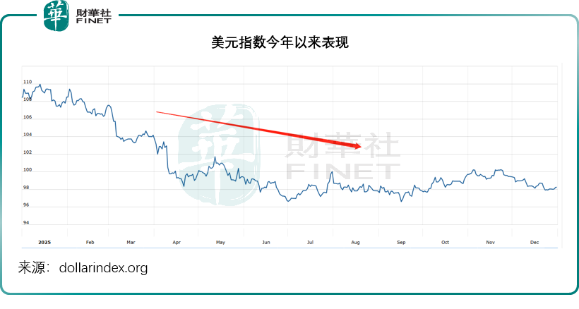 最後卻以一場深刻的下跌,為2025年畫上休止符,美元指數從年初時的108.13點,跌至如今的98.261,跌幅達9.13%,見下圖。