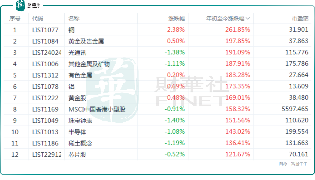 數據顯示,截至12月31日,港股銅板塊年內累漲261.85%,黃金及貴金屬板塊漲197.85%,其他金屬及礦物板塊漲187.91%,有色金屬、鋁、黃金股、稀土概念也都在年內實現翻倍上漲。