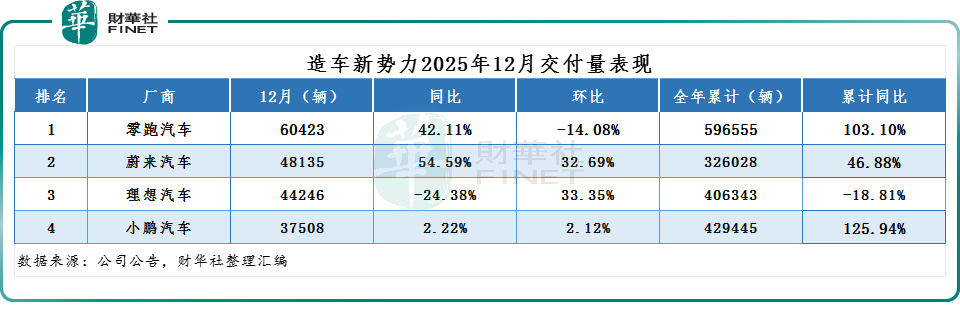 在新勢力陣營中,零跑汽車12月交付60423輛,同比增長42.11%,環比下滑14.08%;全年累計交付59.66萬輛汽車,同比大增103.1%,創新勢力年銷量新紀錄,是2025年新勢力最大的「黑馬」。