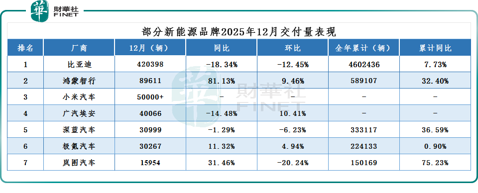 消息面,2026年新年伊始,各大新能源車企陸續披露2025年12月交付數據,為全年收官。整體來看,行業呈現「強者恆強」的格局。