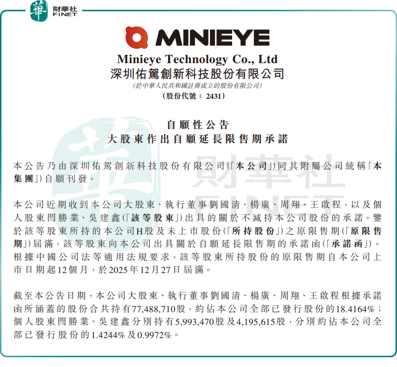 1月5日,佑駕創新發布公告稱,收到公司大股東、執行董事劉國清、楊廣、周翔、王啟程,以及個人股東閆勝業、吳建鑫出具的關於不減持公司股份的承諾。即自願延長股份禁售期承諾。其中,劉國清、楊廣、周翔、王啟程鎖定期延長12個月至2026年12月27日(包含當日);閆勝業、吳建鑫鎖定期延長6個月至2026年6月27日(包含當日)止。在該延長鎖定期內,不會以任何方式直接或間接減持該等股份。