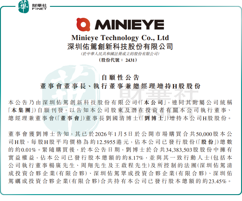 同日,佑駕創新還公告稱,公司董事會董事長、執行董事兼總經理劉國清於2026年1月5日在公開市場增持公司H股股份,共計5萬股,每股平均價格為12.5955港元,占公司已發行股份總數約0.01%。