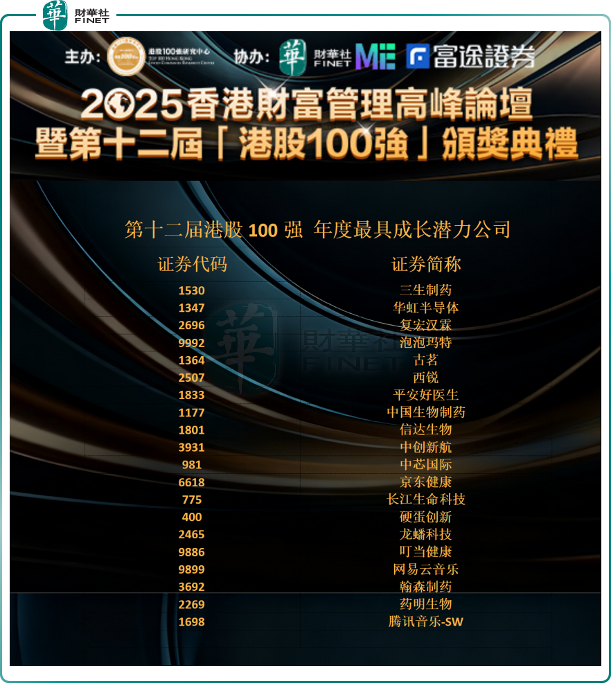 在第十二屆港股100強評選上,港股100強研究中心堅守專業、公正、客觀原則,聚焦新經濟、新賽道,重磅發佈「年度最具成長潛力公司」榜單。