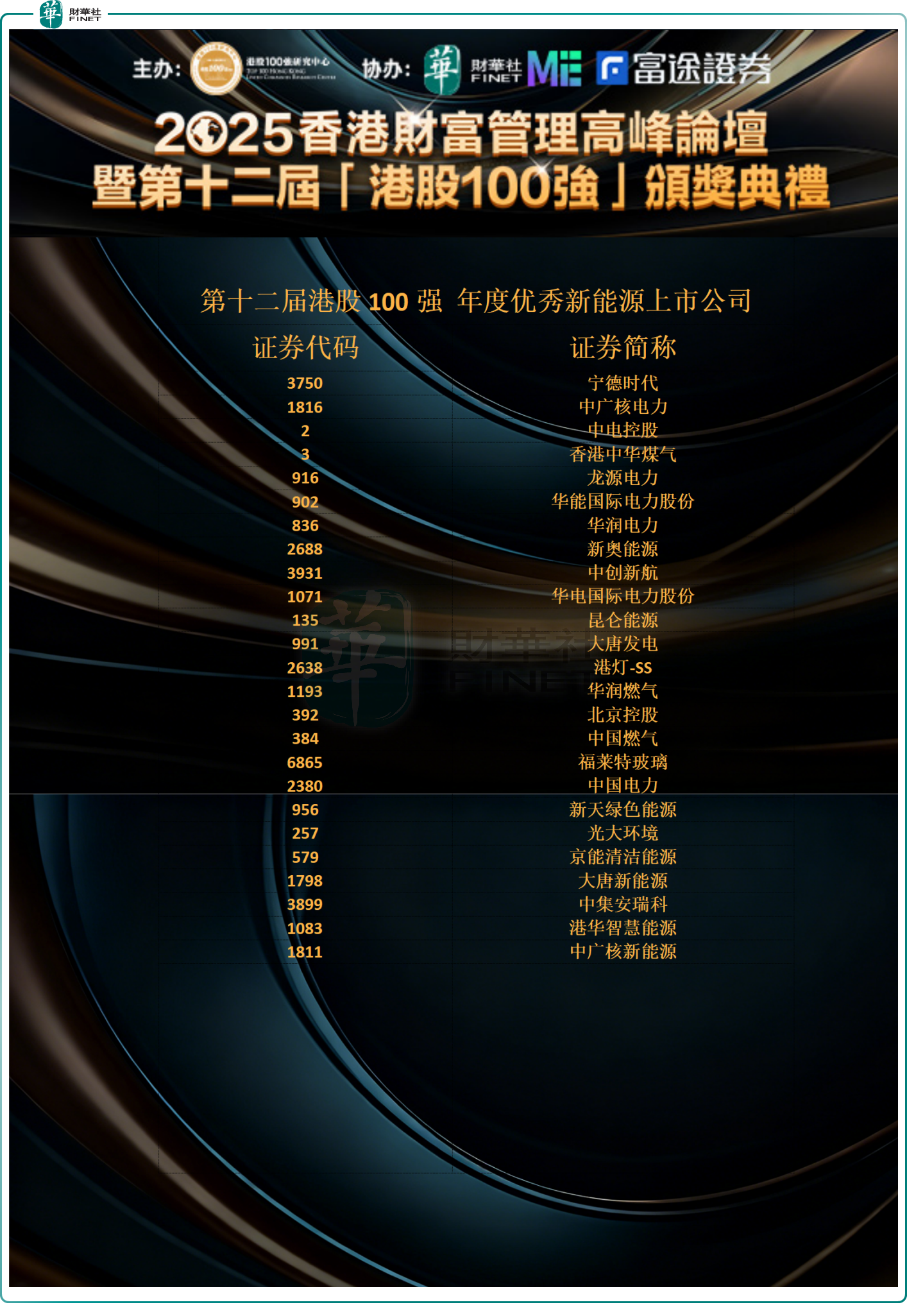 以下是第十二屆港股100強「年度優秀新能源上市公司」榜單獲獎企業名單(25名):