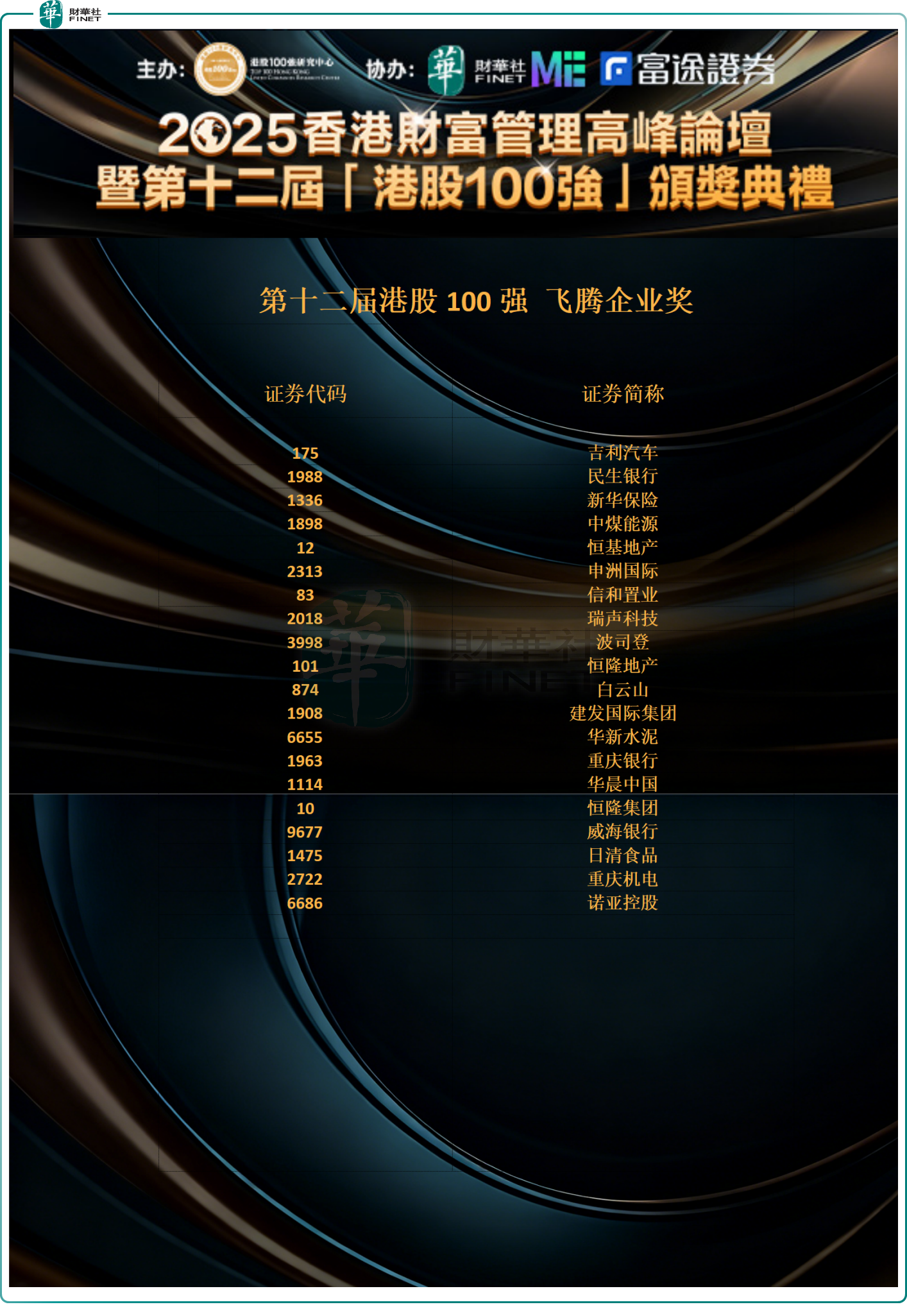 以下是第十二屆港股100強「飛騰企業獎」榜單獲獎企業名單(20名):