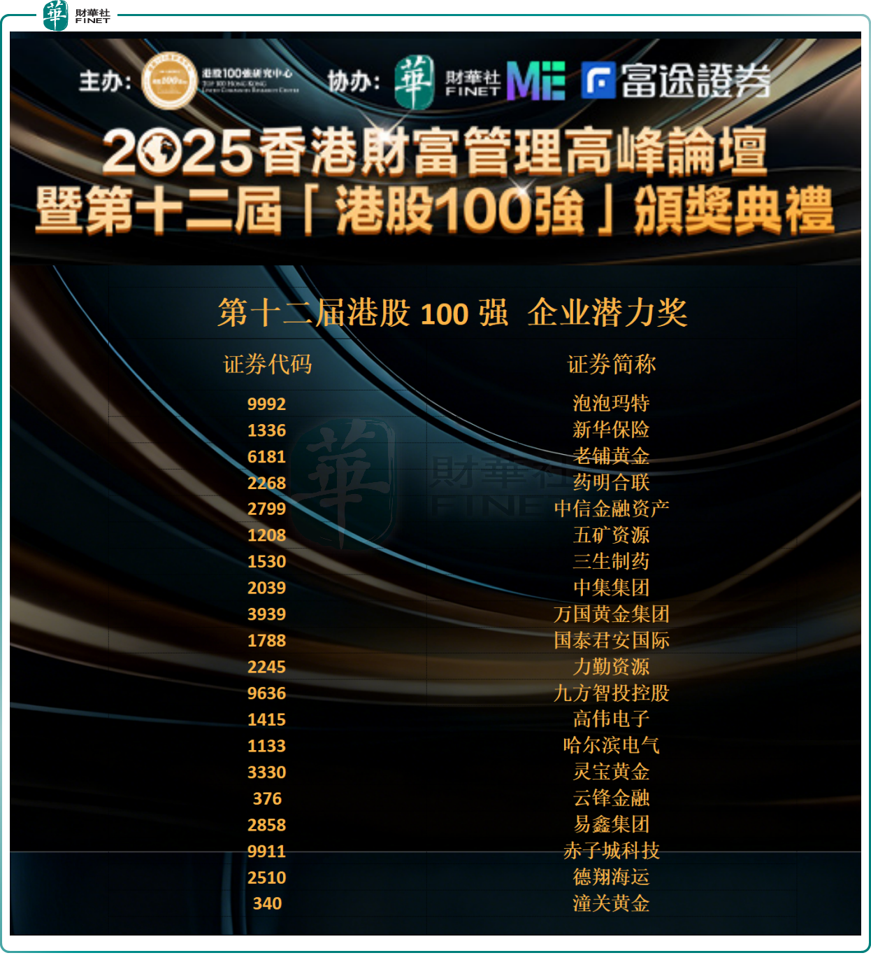 「港股100強」子榜單「企業潛力獎」,以市值、稅後淨利潤為核心準入門檻,結合企業成長韌性、創新能力等多維度,經嚴謹評估與專業遴選,最終遴選出兼具強勁增長動能與卓越市場表現的港股上市企業。