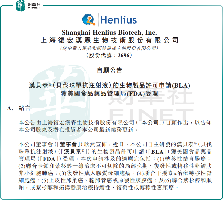2026年1月13日,漢貝泰(貝伐珠單抗注射液)的生物製品許可申請(BLA)獲美國食品藥品管理局(FDA)受理。