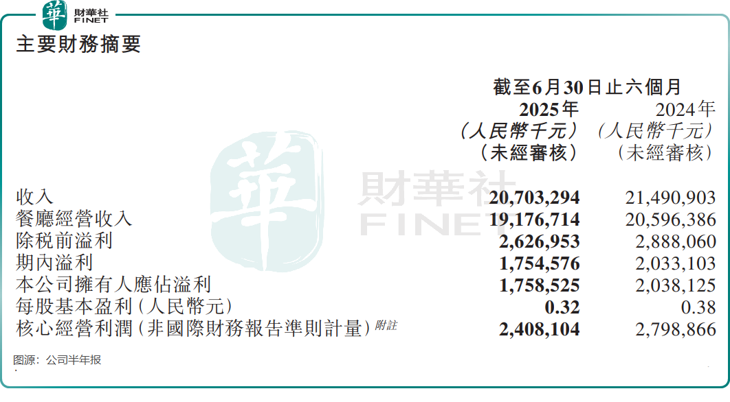 從經營數據來看,海底撈已陷入明顯的增長停滯。2025年上半年財報顯示,公司實現營收207.03億元(單位人民幣,下同),同比下降3.7%;核心經營利潤24.08億元,同比下降14.0%。公司擁有人應占溢利17.59億元,同比下滑13.7%。