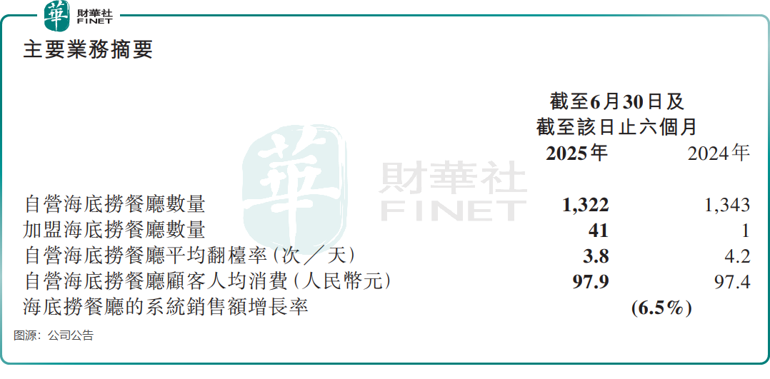 作為餐飲業生命線的翻台率,在2025年上半年降至3.8次/天,較2024年同期的4.2次/天顯著下滑,客流與客單價增長雙雙疲軟。公司門店布局方面也繼續處於收縮調整期,2025年6月底自營海底撈餐廳數量為1322家,同比淨減少21家餐廳,依靠自身資本規模擴張拉動的舊模式難以為繼。