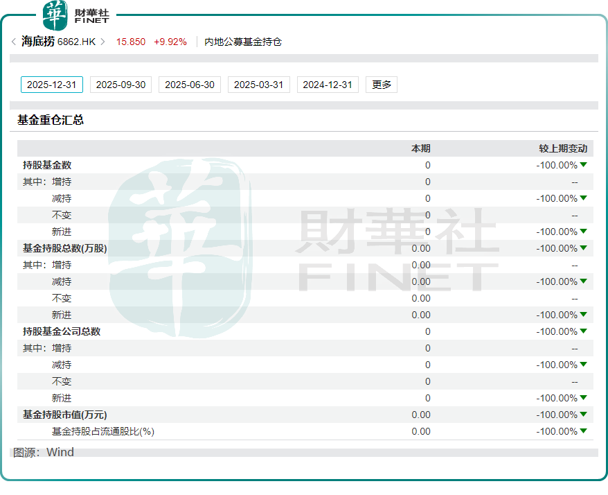雪上加霜的是,資本市場信心持續流失。截至2026年1月13日收盤,海底撈股價較五年前的歷史高點已暴跌超過80%。機構投資者也在撤離,Wind數據顯示,2025年末重倉海底撈的內地公募基金數量從2024年末的25只銳減至0只。高盛和摩根大通等知名機構相繼退出,市場憂慮情緒濃厚。