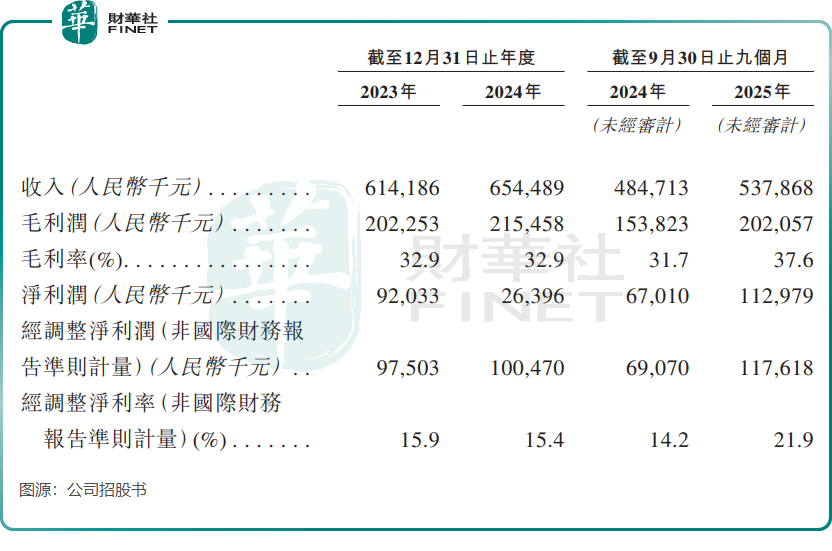 首先是利潤波動劇烈的問題。招股書數據顯示,公司營收保持穩健增長,2023年至2024年營業收入分別為6.14億元(單位人民幣,下同)和6.54億元;2025年前九個月營收達5.38億元,延續增長態勢。但利潤表現卻大起大落,2024年公司淨利潤僅2639.6萬元,同比大幅下滑超七成。