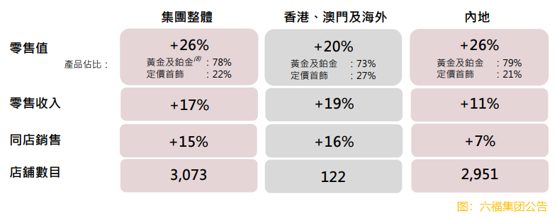 集團整體黃金產品的同店銷售為+15%,而定價產品則為+17%,其中定價黃金產品同店銷售升幅在高基數下仍達32%。