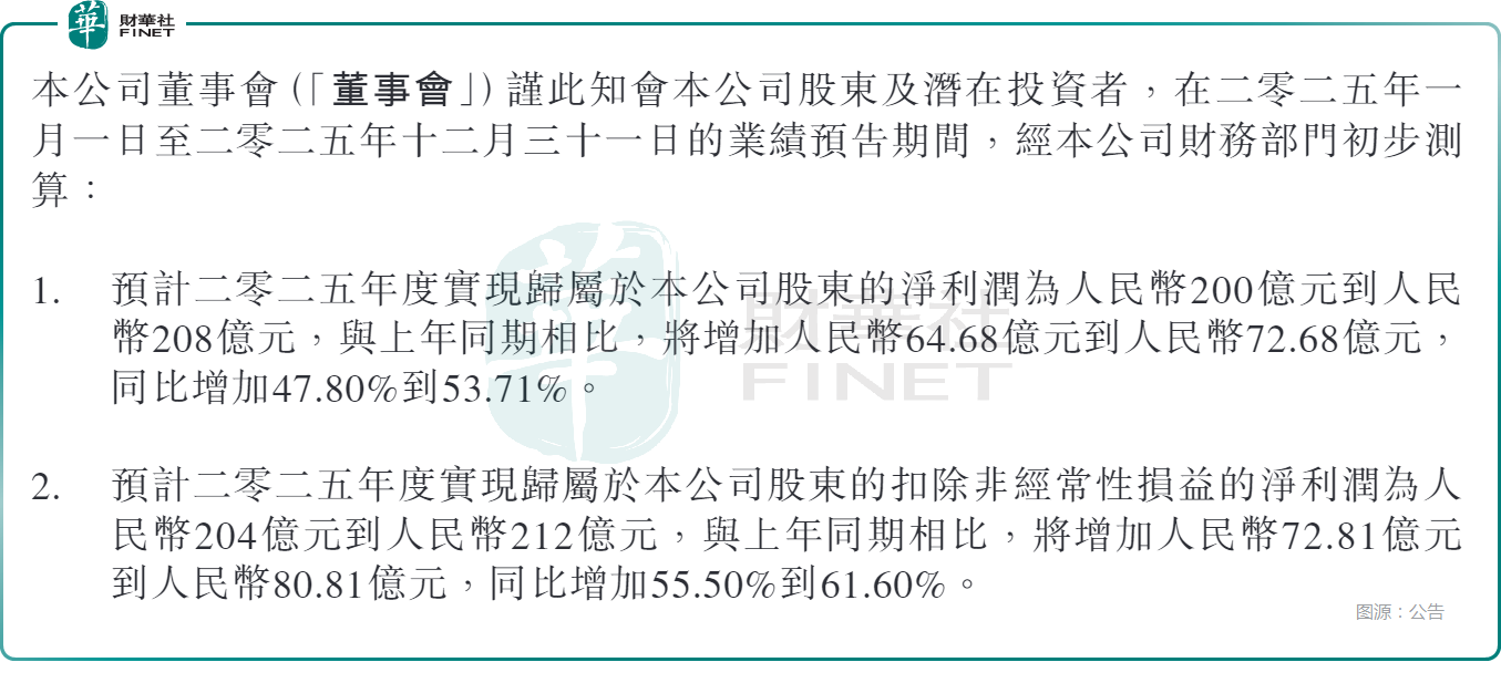 1月15日盤後,洛陽鉬業發布了盈喜公告,2025年,預期實現歸母淨利潤200億元(人民幣,下同)至208億元,同比大增47.80%至53.71%;預期實現扣非淨利潤204億元至212億元,同比增幅更高達55.5%至61.6%。