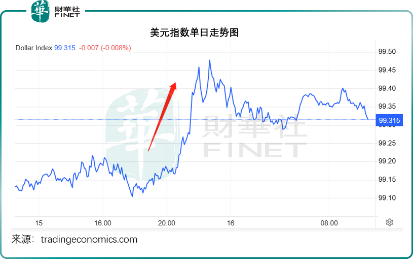 受此推動,美元指數走強,見下圖,美元指數99.1水平上升至99.3,並保持。