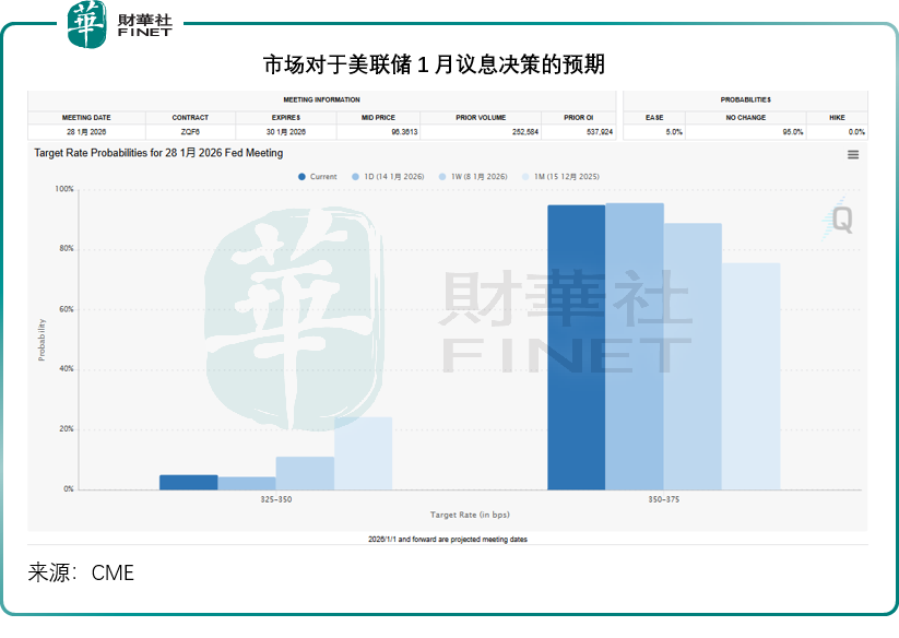 這反映美國經濟表現強勁,市場進一步確認了美聯儲於2026年1月28日議息期間維持利率不變的預期,維持聯邦基金利率於3.50%-3.75%水平的預期比例從一周前的88.9%上升至當前的95.0%,見下圖。