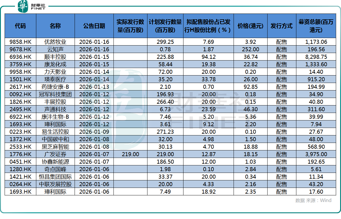 Wind數據顯示,年初至今(截至1月16日收盤),29家港股企業的增發配股(包含配售、供股、代價發行)規模逼近263億港元,同樣遠超2025年同期的10.7億港元。