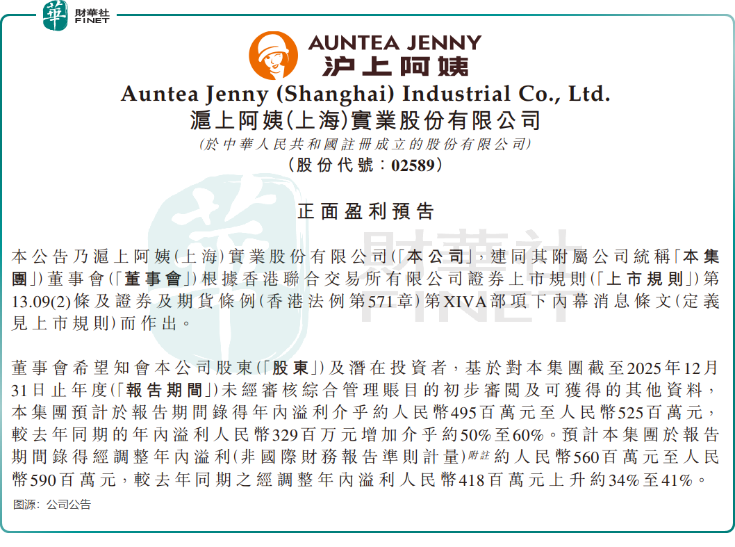 根據滬上阿姨發布的業績預告,公司預計2025年度實現淨利潤4.95億元(單位:人民幣,下同)至5.25億元,同比增長50%至60%,全年預計增速較上半年已實現的增速(20.9%)大幅提升,顯示出強勁的增長勢頭。