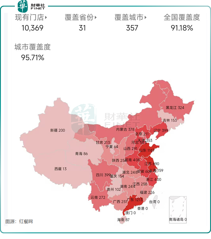 在門店擴張方面,隨著現製茶飲行業進入「淘汰賽」階段,中小品牌因供應鏈能力弱、資金有限等問題加速退出市場,市場份額持續向頭部品牌集中。滬上阿姨享受到了市場紅利。根據紅餐網數據,截至目前,滬上阿姨門店總數已突破1萬家,達10369家,規模僅次於蜜雪冰城和古茗;業務覆蓋全國357座城市,城市覆蓋率達95.71%。多品牌發展策略與持續的渠道擴張,共同推動了公司營收與利潤規模的增長。