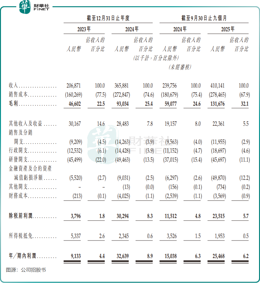 公司財務數據表現亮眼,2023年、2024年營收分別為2.07億元(單位人民幣,下同)和3.66億元,2025年前三季進一步增至4.10億元,同比增速達71.1%;期內利潤同步高增,從2023年的913.3萬元飙升至2024年的3263.9萬元,2025年前三季達2546.8萬元,延續高增長態勢。