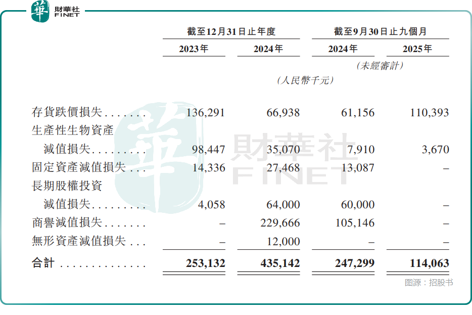君樂寶的資產減值損失包括存貨跌價損失、生產性生物資產減值損失、固定資產減值損失、長期股權投資減值損失、商譽減值損失,以及無形資產減值損失。而在2023年、2024年及2025年前三季度,君樂寶均產生了資產減值損失,其中商譽減值方面值得重點關注,經過2024年減值之後,截至2025年9月末,其賬上商譽仍超過5億元。