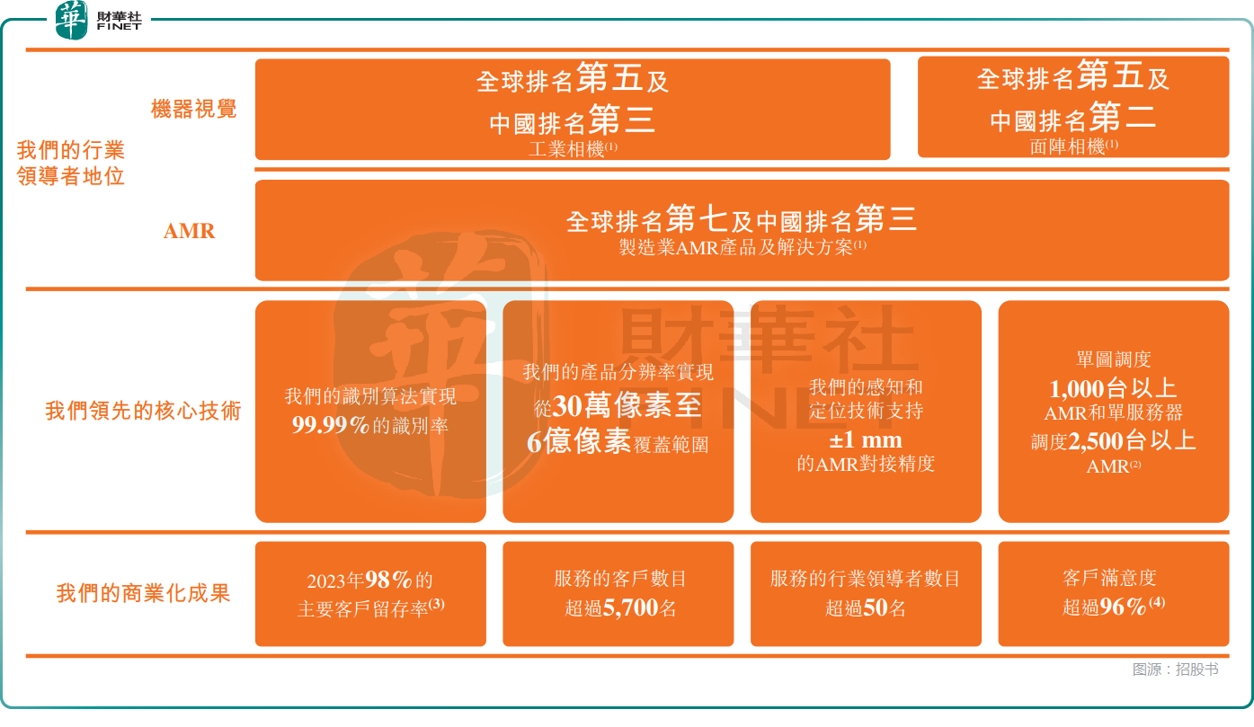 據弗若斯特沙利文報告,按2024年銷售收入計,其工業相機業務全球排名第五、中國第三;製造業AMR業務全球排名第七、中國第三,行業地位不俗。