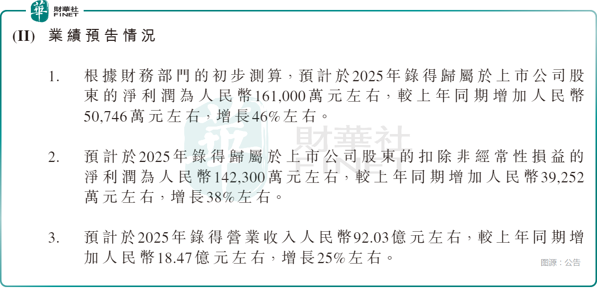 1月22日盤後,兆易創新發布了最新業績預告,預計2025年實現營收92.03億元左右,同比增長約25%;預計2025年錄得歸母淨利潤16.1億元(人民幣,下同)左右,同比增長約46%;預計實現扣非淨利潤14.23億元左右,同比增長約38%。