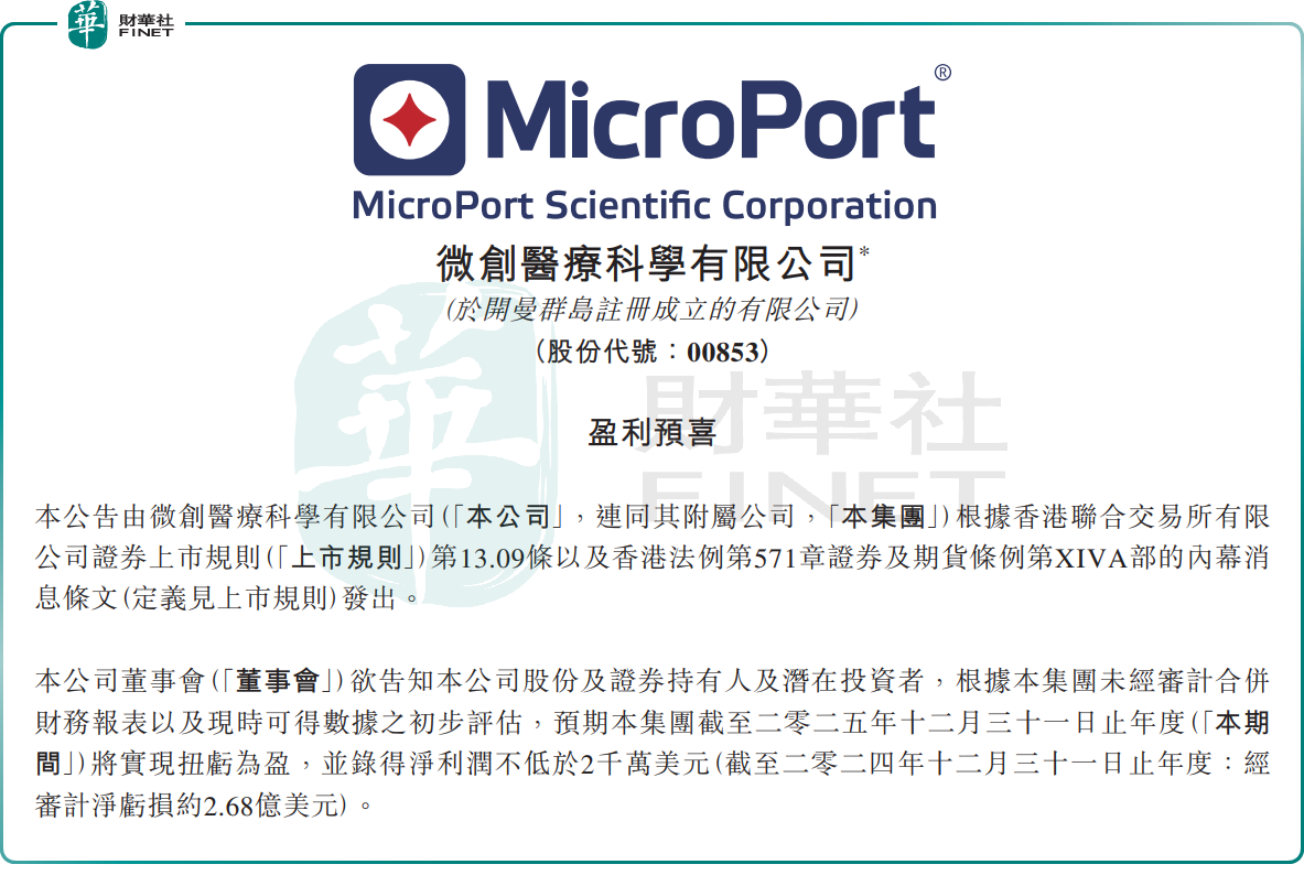 1月22日,微創醫療發布盈利預喜公告,預計2025年將實現扭虧為盈,錄得淨利潤不低於2000萬美元,2024年則淨虧損約2.68億美元。