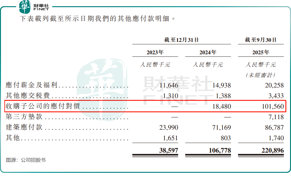現金儲備的緊張狀況更是觸目驚心。截至2025年9月30日,蓮池醫院的現金及現金等價物僅餘7740.2萬元,而同期公司的流動負債高達3.65億元,其中其他應付款高達2.21億元,僅因收購子公司形成的應付賬款就有1.02億元。有限的可變現資金與高額短期負債形成鮮明對比,短期資金周轉壓力已然拉滿。