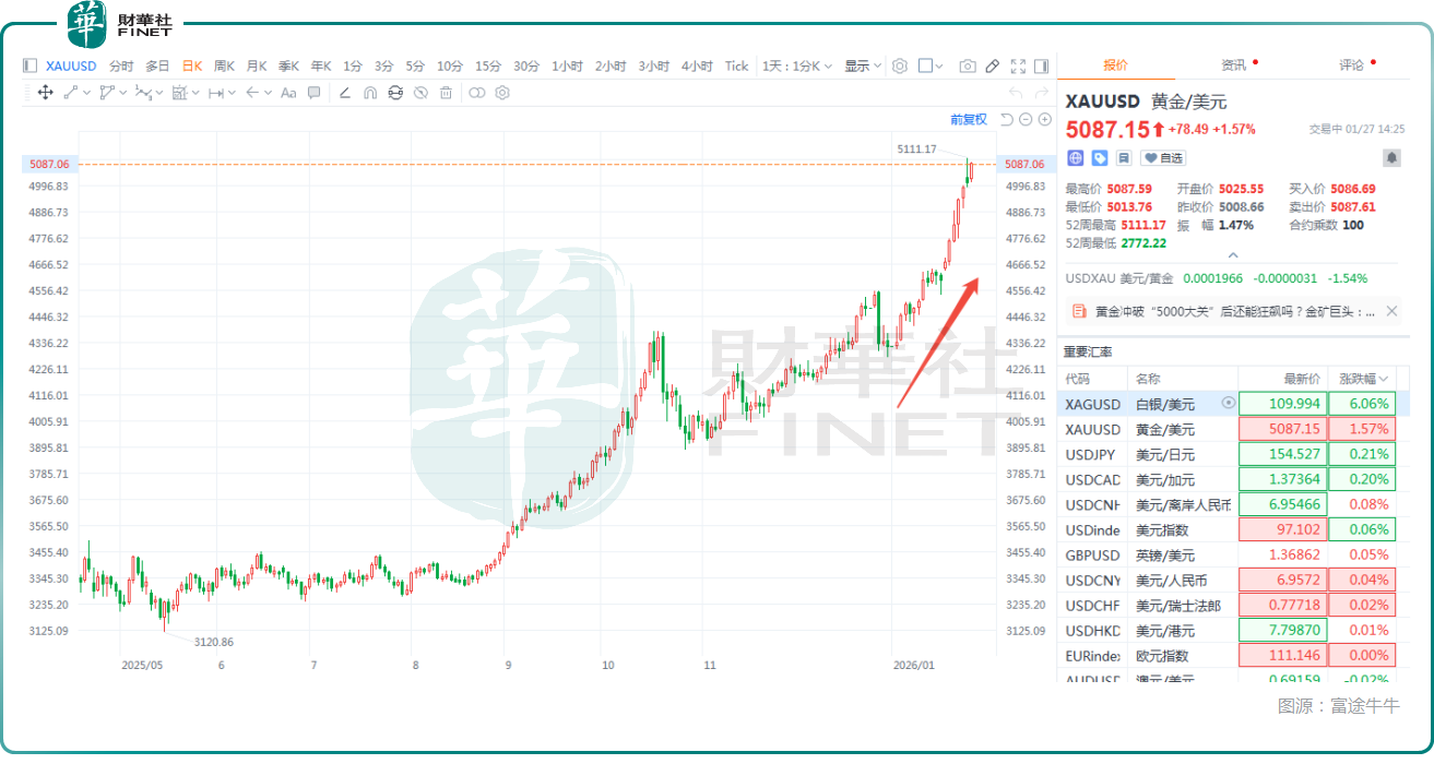 進入2026年,黃金的上漲之勢未曾稍歇,金價還在一路攀升,並於1月26日歷史首次突破5100美元的整數關口,但隨後遭遇回落。而截至1月27日發稿時間,金價再漲近1.6%,現報5085美元/盎司,非常接近前一日創下的歷史新高價位。