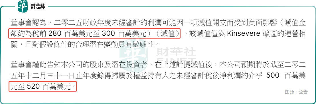 公告顯示,五礦資源董事會認為,2025財年(年結日為12月31日)未經審計的利潤可能因一項減值開支而受到負面影響(減值金額約為稅前2.8億美元至3.0億美元)(減值)。該減值僅與Kinsevere礦區的運營相關,且對假設條件的合理潛在變動具有敏感性。
