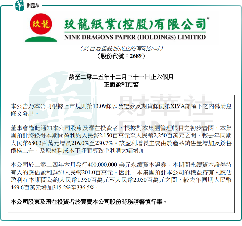 公告顯示,玖龍紙業預計截至2025年12月31日止六個月將錄得盈利約21.5億元至22.5億元(單位人民幣,下同),同比增長216%至230.7%。這一顯著增長,主要歸因於公司產品銷售量增加及銷售價格上升,及原材料成本下降而導致毛利潤大幅增加。