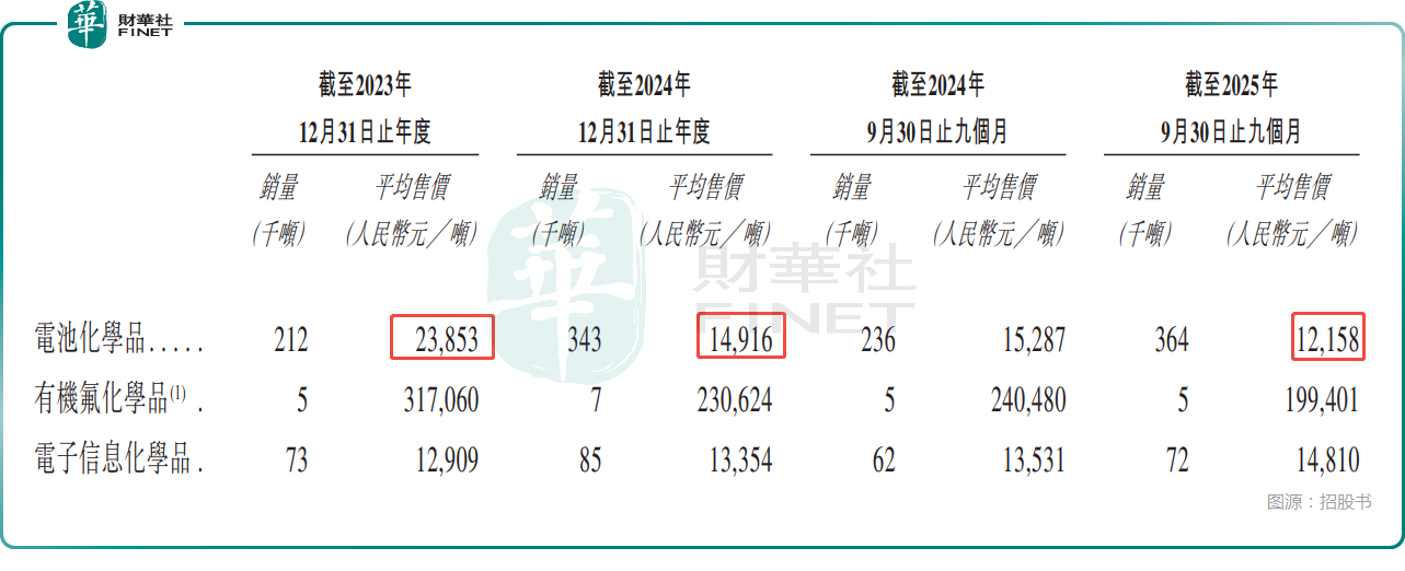 而電池化學品的毛利率下滑在很大程度上也和平均售價持續下降有關,從2023年的2.385萬元/噸,已經降到了2025年前三季度的1.216萬元/噸,降幅巨大,而銷量則是在持續增長。