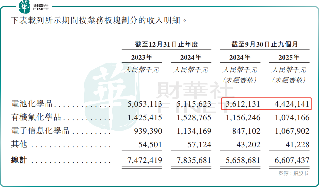 從業務結構看,電池化學品是其核心收入來源,2025年前三季度貢獻收入44.24億元,占比67.0%;電子信息化學品收入10.68億元,占比16.2%;有機氟化學品收入10.74億元,占比16.3%。