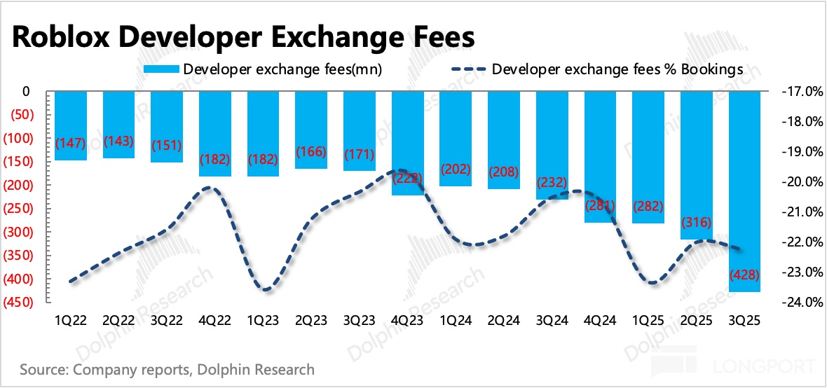 目前 Roblox 面向遊戲開發者的流水收取 30%,剔除 Robux 與真實貨幣兌入兌出的比例差額、平臺給予的創作者激勵等因素影響,依據財報計算得平臺的分成比例是 22%。如果開發者不採用 Roblox 的編輯器開發遊戲,平臺還能夠收取這麼高的 take rate 嗎?