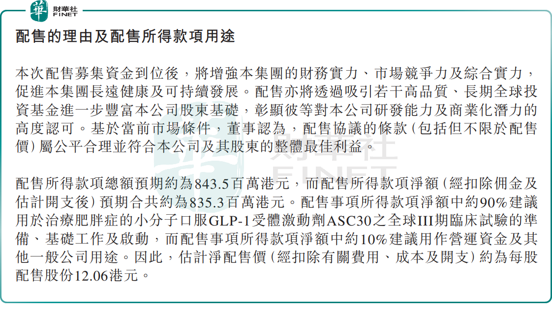 配售籌資8.35億港元,聚焦「減肥藥」項目