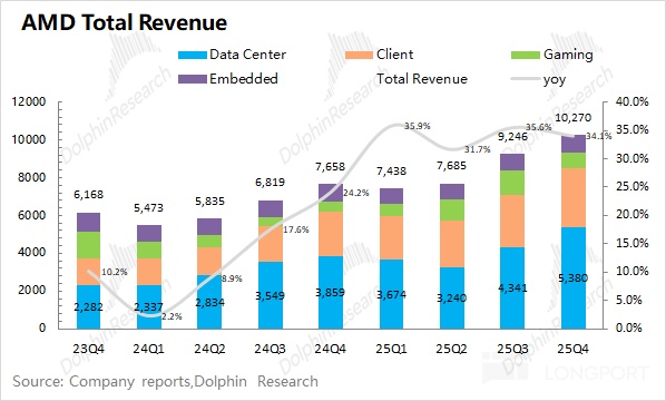 AMD 在 2025 年第四季度實現營收 102.7 億美元,同比增長 34%,好於上調後的市場預期(100 億美元左右)。公司本季度收入端的同比增長,主要得益於數據中心 CPU、客戶端業務的帶動。