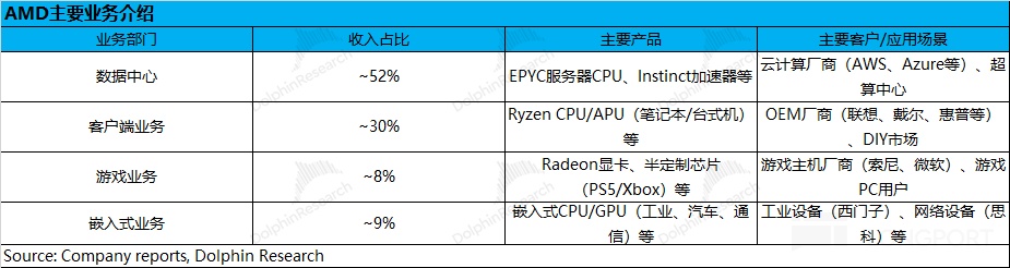 從公司的分業務情況看,數據中心和客戶端業務是公司當前的主要業務,兩者佔比達到了 80% 以上。受益於 AI GPU 的出貨增加和服務器 CPU 需求回暖,數據中心業務的佔比繼續提升。