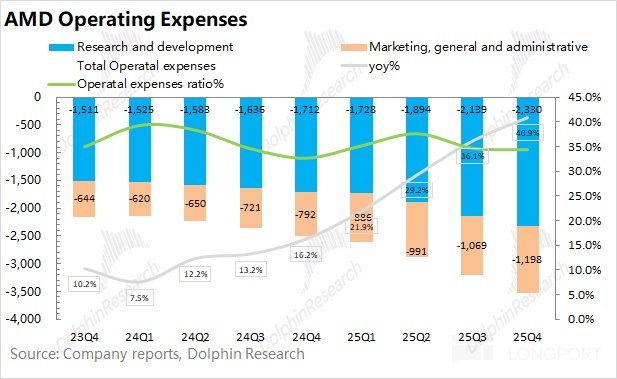 AMD 在 2025 年第四季度的經營費用爲 35.3 億美元,同比增長 41%。其中研發費用和銷售及管理費用都有不同幅度的增加。