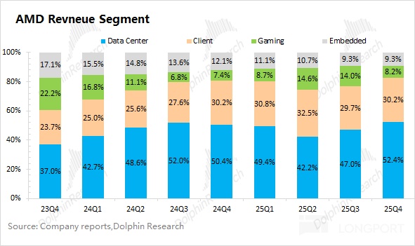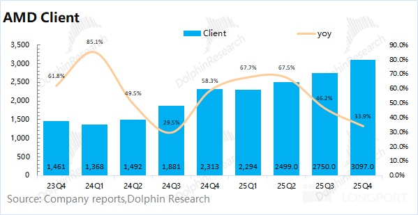 AMD 的客戶端業務在 2025 年第四季度實現收入 31 億美元,同比增長 34%,好於市場預期(29 億美元)。客戶端業務的增長,主要得益於 PC 市場回暖以及對英特爾份額的侵蝕。