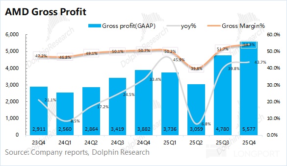 AMD 在 2025 年第四季度實現毛利 55.8 億美元,同比增加 44%。其中本季度的毛利率爲 54.3%,出現明顯回升。