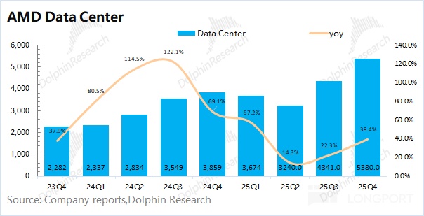 AMD 的數據中心業務在 2025 年第四季度實現收入 53.8 億美元,同比增長 39%,達到市場上調後的預期(53 億美元左右)。本季度的同比增長,主要服務器 CPU 出貨增長和 MI308 的再次銷售。