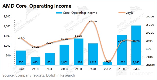 在剔除收購費用等影響後,海豚君測算 AMD 本季度的核心經營利潤爲 20.5 億美元,繼續回升。本季度公司受 MI308 庫存銷售的影響(對毛利約 3.6 億增厚),如剔除該影響,公司本季度核心經營利潤仍有提升,受益於服務器 CPU 回暖的帶動。