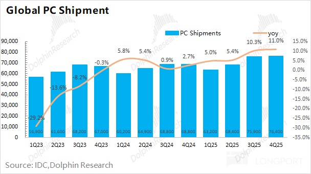 結合行業數據看,2025 年第四季度全球 PC 出貨量 7640 萬臺,同比增長 11%。與此同時,AMD 的客戶端業務卻能取得34% 的同比增長。相比來看,英特爾的客戶端業務同比仍下滑 6.6%。