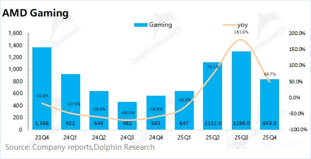 具體來看,①半定製業務:同比增長但環比下滑,預計 2026 年因主機週期進入第 7 年,而微軟下一代 Xbox(搭載 AMD 半定製 SoC)預計 2027 年推出;②遊戲 GPU:Radeon RX9000 系列在假期期間需求旺盛,渠道銷量增長。