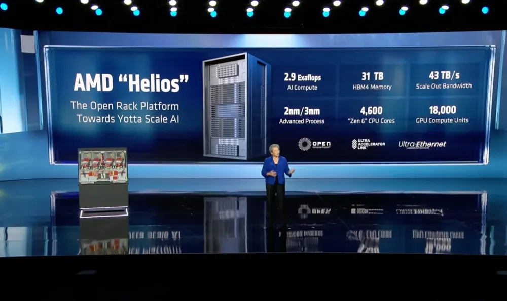 Helios 機架將支持最多 72 塊 MI455X GPU,通過 “43TB/s 橫向擴展帶寬”(超以太網技術)和 “全液冷設計”,實現跨 GPU、跨機架的高效協同,單機架 AI 算力達 2.9ExaFLOPS(FP4)。