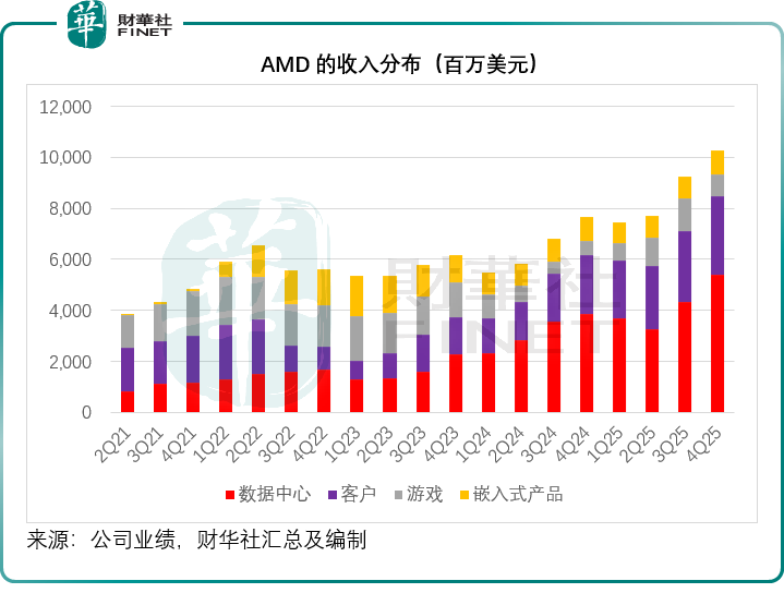 AMD截至2025年12月27日止的季度業績顯示,在AI芯片推動下,數據中心分部的季度收入同比增長39.41%,至53.80億美元,客戶和遊戲分部均實現強勁增長,季度收入分別按年增長33.90%和49.73%,至30.97億美元和8.43億美元。其季度總收入同比增長34.11%,至102.70億美元,高於市場預期的96.7億美元。