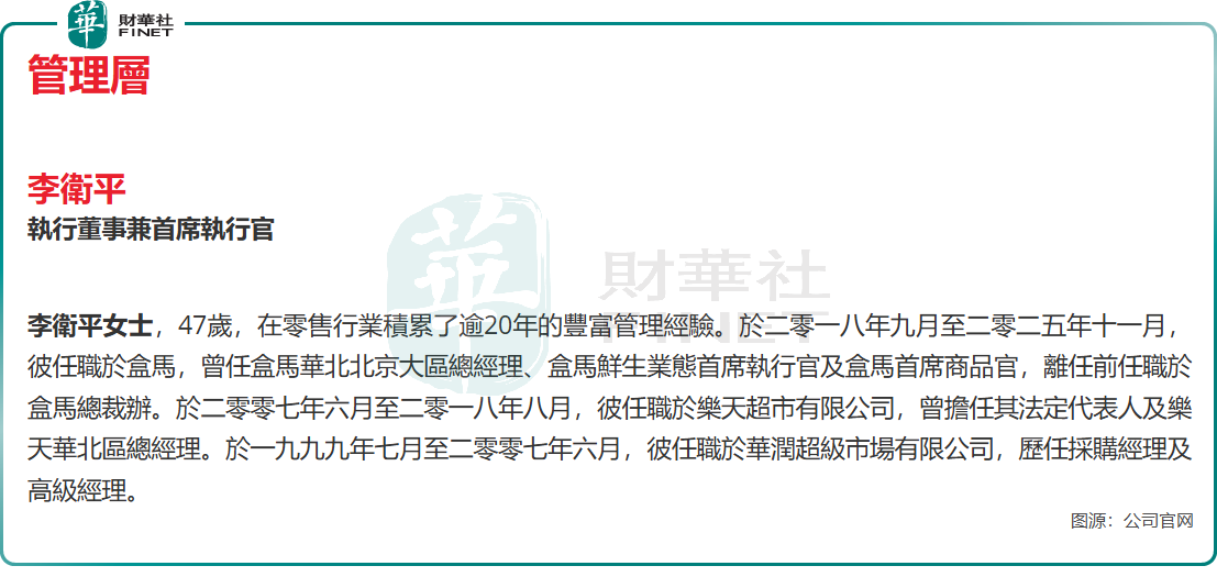 資料顯示,李衛平曾在1999年於華潤超級市場有限公司擔任採購經理及高級經理,並於2007年加入樂天超市任華北區總經理;2018年跳槽至盒馬後,她一路晉升至首席商品官,主導過區域業務扭虧、全國業態運營等關鍵項目,被業內評價為「業務能力強且擅長團隊協作」。