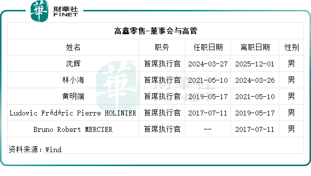 2025年12月,沈輝接任CEO不到兩年便因「家庭事務」辭職;此前林小海擔任公司CEO的任期也不足三年;就連帶領大潤發成長為零售巨頭的黃明端,在阿里系資本主導時期也逐漸淡出管理核心。短短數年間,核心管理層頻繁更迭,讓公司戰略難以形成長期連貫的執行路徑,這也成為高鑫零售轉型乏力的重要誘因。