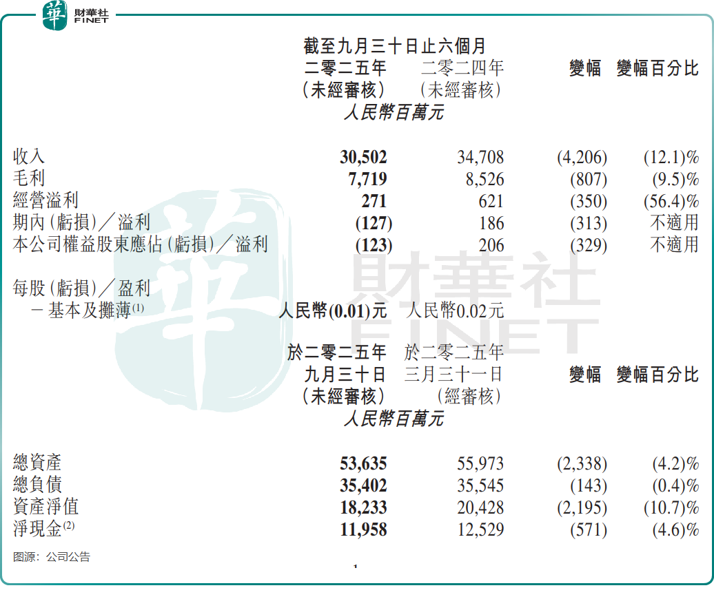 業績層面,高鑫零售的盈利穩定性持續惡化。財報顯示,截至2025年9月30日的六個月,公司實現收入305.02億元(單位人民幣,下同),同比減少12.1%;並由盈轉虧,期內虧損達1.27億元。