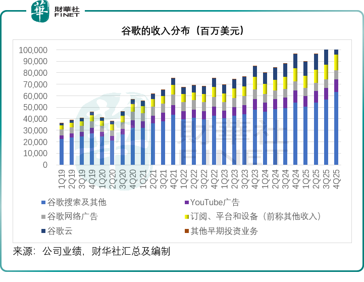 2025年第4季,谷歌搜索及其他廣告營收增長16.73%,至630.73億美元,所有主要垂直領域均保持增長,其中零售貢獻最大。YouTube廣告營收增長8.69%,至113.83億美元,由直接響應廣告驅動,增幅有所減緩,管理層解釋是因為受到了與2024年美國大選相關的強勁支出的同比基數效應影響。同理,網絡廣告營收78.28億美元,下降1.58%。訂閱、平台和設備季度營收同比增長16.72%,至135.78億美元,得益於YouTube訂閱的強勁增長,特別是YouTube Music和Premium,以及Google One因AI方案需求增加而增長。
